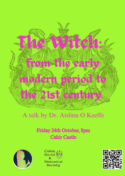 The Daughters of Dún Iascaigh, with support from Cahir Social and Historical Society, are delighted to host Dr. Aislinn O'Keeffe on Friday, 24th October at 8pm in the Great Hall of Cahir Castle. Aislinn is back this Halloween to give a talk about 'witches' from early modern times up to the 21st century. It is a great honour to host Aislinn, as we endeavour to recognise women in history and the significant contributions they made throughout time.