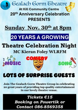 The Gealach Gorm Theatre Group celebrate 20 years of providing top quality entertainment in their lovely theatre venue. A great night of music song and comedy with lots of special guests. Come along and join the celebrations.